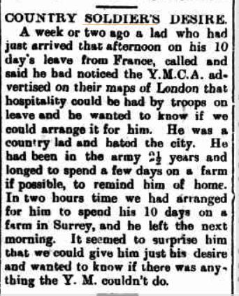 When the war broke out … he went to the Crystal Palace for his training, and the YMCA was there. He was drafted out to Gallipoli and to his amazement he found the YMCA on the Peninsula. He was wounded and sent to Suez where once more the YMCA was a great help to him, and yesterday … I received a letter from him from Alexandria saying he was convalescent and spending the whole of his spare time in the central building of the Association.[34]