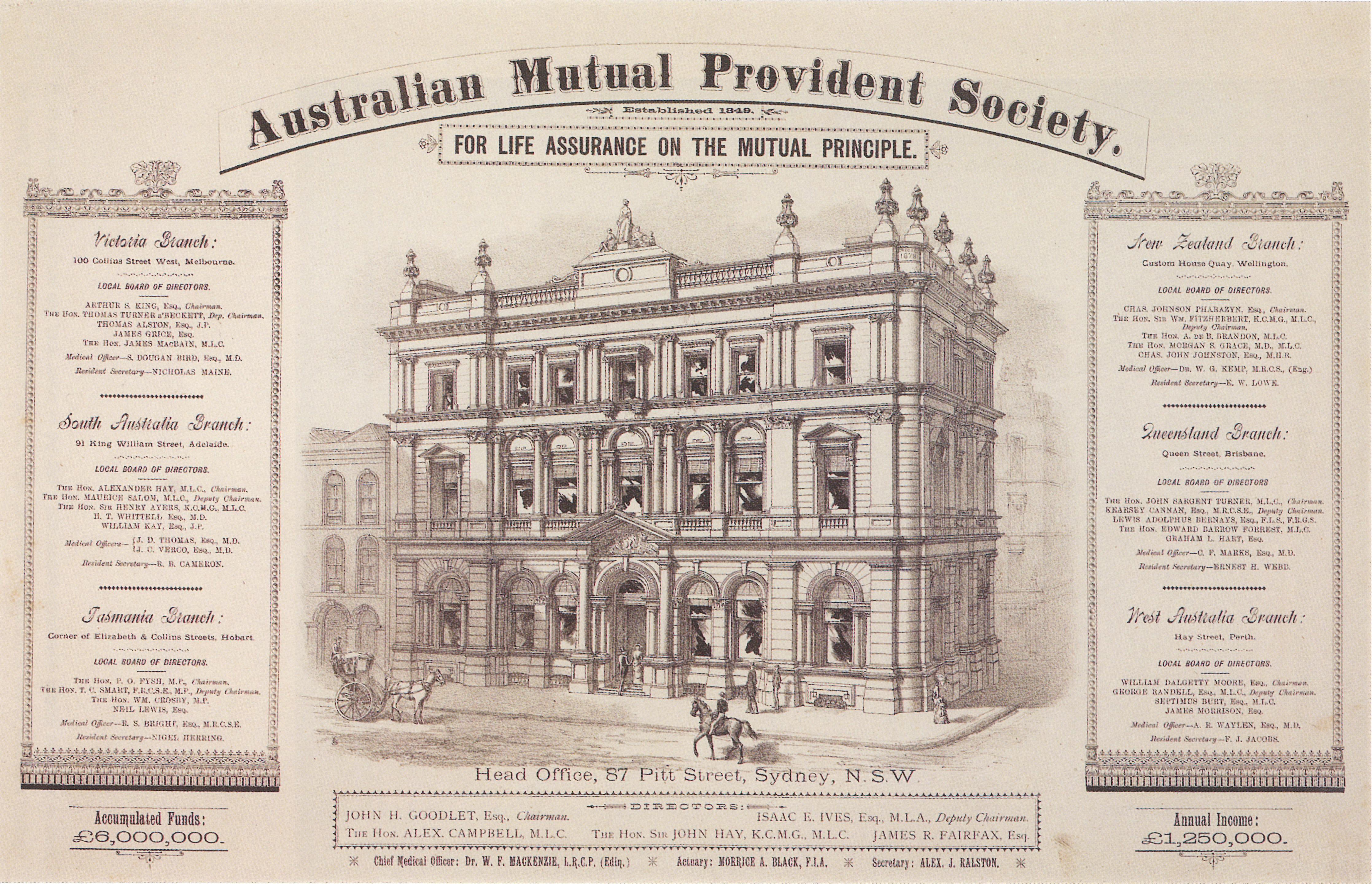 He was an Elder to the General Assembly of the Presbyterian Church in NSW from 1868-1913, a founding Member of St Andrews College, Sydney University on whose board he served from 1870-1913. He was also a founding member of the Presbyterian Ladies College, Sydney on whose board he served from its founding in 1888 until his death. He was a member of the Dayspring Board, a maritime missionary association for 40 years. He was interested in missions and funded the building of a hospital for Women in Sholinghur in India. He was a Director of AMP from 1866-1886 and its chairman from 1883-1886, a founding member of the Sydney City Mission, a director of the Deaf & Dumb & Blind Institute from 1879-1914 and its President 1910-1914,. He was also a member of the Ragged Schools organising committee 1875-1896, a member of the Highland Society and its President 1892-4, Treasurer of YMCA 1878-1914, a member of the Sydney Hospital Board 1863-38, 1899-1914, a committee member of the Sydney Female Refuge Society 1862-1914 and a member of the Council of the Agricultural Society 1870-1873.