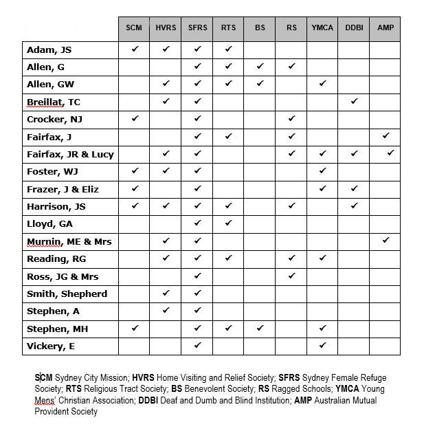 The work of the Sydney Female Refuge Society (SFRS) was widely reported in the Sydney newspapers of the day, and a large number of its annual reports and minutes for the period 1860 to 1900 are still available. For these reasons, a close examination of its membership is possible and this throws light on the committee members’ social and religious relationships. This charity conformed to a common model among nineteenth century charities with a separate ‘ladies committee’ and a ‘gentlemen’s committee’ and it has been possible to establish their membership over this 40 year span during which time some 198 individuals (104 women and 94 men) served as members. While no-one over this period equalled the record of service of its secretary Ann Goodlet (the full 40 years for Ann and 39 years for her husband, John) others were involved for considerable lengths of time.[1]