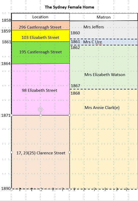 [18] The matron’s position attracted a salary of £50 per annum with board and residence, by 1874 the salary had been increased to £52 per annum. Sydney Home, Annual Report, 1874. The matrons who are known were Mrs Jeffers (1859 – ?) Empire (Sydney, NSW), July 26, 1859, 5), Mrs C Ure (?-1861) Sands Directory 1861, 45; Mrs Elizabeth Watson (1862 – 1867 ) SMH, February 28, 1862,1; City of Sydney Assessment Books 17/8/14, 1863, 22/17/17 ; Sydney Mail (Sydney, NSW) September 21, 1867, 1; Sydney Mail (Sydney, NSW), January 12, 1867, 4; Sands Directory 1866, 399; 1867, 390 Mrs (Stephen) Annie Clark(e) from (1868 -1885 See Sands Directory 1868,, 67; City of Sydney Assessment Book 17/1/11, 1871, 28, 2, 2; Sands Directory 1870-1876; SMH, September 5, 1877, 10; June 10, 1878, 8; December 20, 1879, 15; December 11, 1880, 18; March 29, 1881, 10; February 22, 1882, 17; January 16, 1883, 3; June 2, 1884, 12; April 28, 1885, 14; May 29, 1888, 14; April 29, 1890, 12.