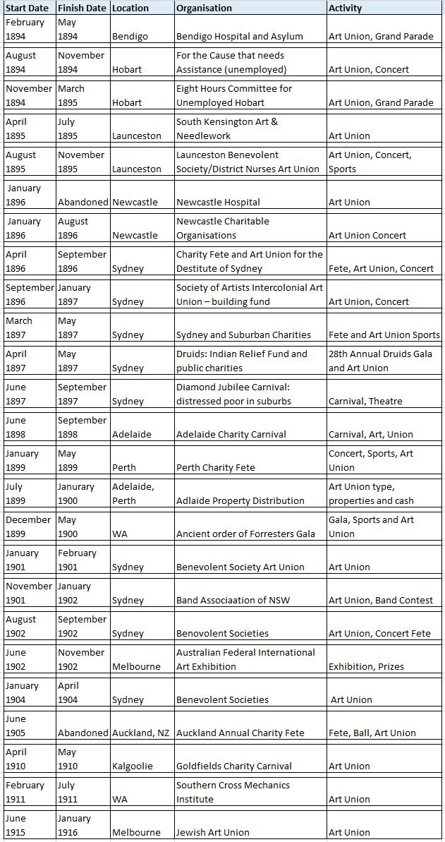 Gordon refined this early process and ran across most colonies of Australia what were, in essence, lotteries for the purpose of raising funds for charity, though some suggested that the main charitable beneficiary of these ‘Art Unions’ was Gordon himself. In the 1890s, a depression hit Australia and unemployment increased as businesses were bankrupted and ceased operation and giving for charitable purposes was significantly reduced as individuals sought to prune their expenditure. This took place against the background of an increasing need for the services of the various benevolent institutions as the unemployed applied for assistance. So when a fundraising opportunity presented itself to various charitable bodies via Gordon’s Art Unions it was, to many charities, a great opportunity to gain access to much-needed funds.