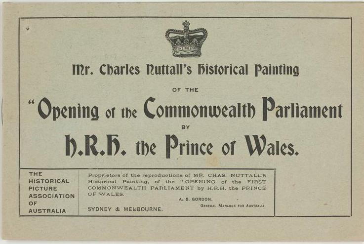 In June 1903, Gordon began to promote the purchase of copies of Charles Nuttall’s Federation painting, ‘The First Federal Parliament of Australia, May 1901’, for which he had gained an exclusive distribution right. He did this by writing directly to councils, organisations and schools, by running advertisements in the newspapers or by paying personal visits.[59] A special brochure was printed which had facsimiles of the signatures of members of the First Federal Ministry ‘all of whom have granted their official patronage to Mr Nuttall’s Historical Picture copies of which are now offered to the public’. He also sought to find agents in every town and city and canvassers to be involved in the sale of these works.[60] Initially, he sold Artist’s Proofs at £15 15 shillings each, Proofs ‘before letters’ at £10 10 shillings and India prints at £3 3 shillings.[61] In 1906, a postcard print was produced to mark the Federal Election.[62]