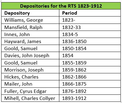 Morrison was not the end of difficulties for the RTS with its appointed Depositors. The RTS annual meeting was not held in 1866 due to the need to dismiss Charles Hickes, their replacement depositor, who had served since 1862. John Mailer was appointed in 1867 and proved a success, bringing much-needed stability to the work of the RTS which was no doubt to the great relief of the Society. He remained the depository until 1874.[52] The appointment of Mailer as Depositor and Edward Rennie, who was at the time chief clerk of the government audit office, to the RTS committee[53] ushered in a phase of increased financial oversight by the society. In the year following Mailer’s appointment, the RTS reported both increased sales and subscriptions.[54] Below is the list of those who acted as Depository for the RTS. [55]