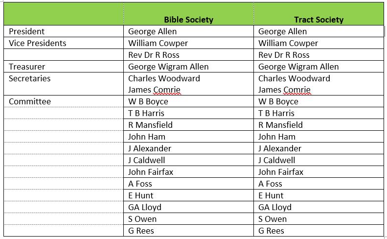 The society struggled to gain local supporters which, by 1842, numbered only 8 ministers and 31 members of Christian Churches in a population of 100,000 or so.[22] The subscriptions in the table above indicate that there was never, apart perhaps for the mid-1850s, strong financial support for the RTS. Indeed, so poor was the support for the RTS, that no annual meeting of the society was held between 1844 and 1847. This lack of support led to the society being unable to pay for its stock of tracts from England and this meant it carried a debt of £35. By 1849, it was decided to hold a joint annual meeting with the NSW Auxiliary Bible Society. This was deemed advisable ‘because of the limited extent of their operations in this colony … the small number of subscribers belonging to each and the saving of expense, particularly in the printing departments that will be effected.’ It was realised that the objects of the societies were very similar, namely