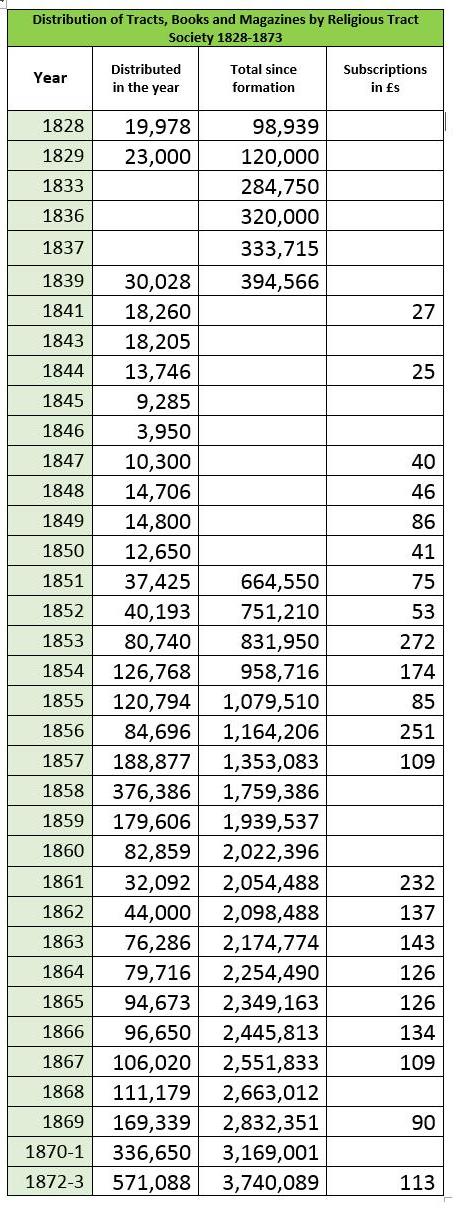 The nature of the tracts was elucidated in 1840 when it was reported that the RTS circulated ‘not only tracts containing portions of the word of God and narratives of wonderful effects produced by them in converting the most abandoned sinners, but the Society also circulated vast numbers of the Scriptures, Luther, Calvin, Cranmer and all the other illustrious reformers.’[13]