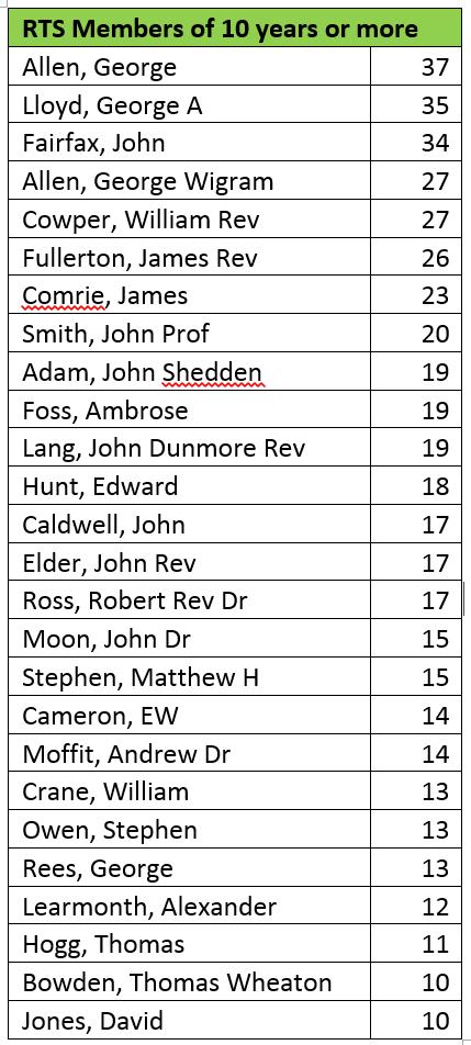 Over time, the RTS was served by numerous philanthropic and Christian men in its governance. Initially, clergy were the leading members of its governance, but as the RTS matured lay Christian business men began to assume the major role in the RTS. Some members served for very long periods of time, such as George Allen, George A Lloyd and John Fairfax, who each served for more than 30 years. Below is a table of the names of those who served 10 years or more and indicates the number of years each one served.