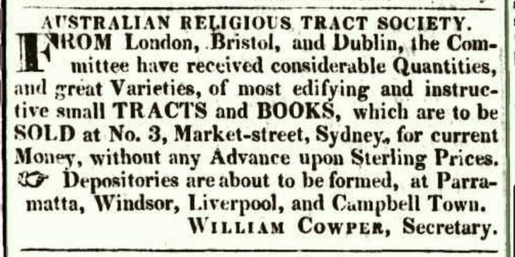 [17] In years like 1846 the reason that so few tracts were distributed was that the stock was exhausted and supply from the parent society had not arrived. SMH, January 22, 1847, 2.