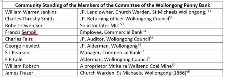 The administrators of the banks were volunteers who freely gave of their time and often paid for the setting up costs. Each PB was to have a committee or trustees who were responsible for the running of the bank. The members of the committee of the Wollongong PB are a good example of those who undertook responsibilities within a PB. They were all, like those of other PBs, prominent and well-known male members of the local community (See Figure 4). Wollongong boasted four JPs on its governance committee[49] and the organisational structure and public face of the PB was somewhat more impressive than was usual, but it was one of the banks that had considerable longevity lasting some 29 years. Probably Francis Sempill, the Secretary and Treasurer, was a key to its success as he was an employee of the Commercial Bank and an initial enthusiastic and energetic promoter of the PB.[50]