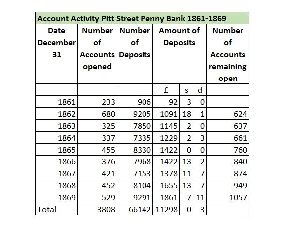 The PBs were popular but their activity levels varied from location to location and over time, but it seems they were well patronised. The Pitt Street Congregational Penny Bank (PSPB), as an example, was well organised and was reported on thoroughly in the newspapers which allows its activity to be examined. Its activity level is revealed in Figure 1. At the end of the PSPB’s first full year of operation, 624 accounts had been opened with 9,205 individual deposits made and £1,092 deposited. Generally, the PSPB was open 50 times a year, every Friday or Saturday evening and with a short break at the end of the year. Given the number of deposits recorded over the period of the table in Figure 1, the PB would need to process on average about 160 separate transactions every day that funds were received and this does not take into account the processing of withdrawals. In order to deal with this workload and the crowding it produced in the banking room, additional volunteer cashiers were used to receive funds and make ledger entries.[29] Even so, a heavy workload, unpaid, fell upon the volunteer bank secretary who was John G Marwick.[30] The level of activity for which a volunteer staff was responsible was unsustainable and eventually Marwick, the principal worker resigned and no one could be found to replace him in his sacrificial and philanthropic role and the bank was forced to close.