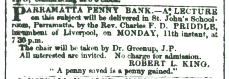 [28] Priddle, C. F. D. Penny Banks : A Lecture with Directions for Their Establishment. (Sydney: Printed by Joseph Cook &, 1861).