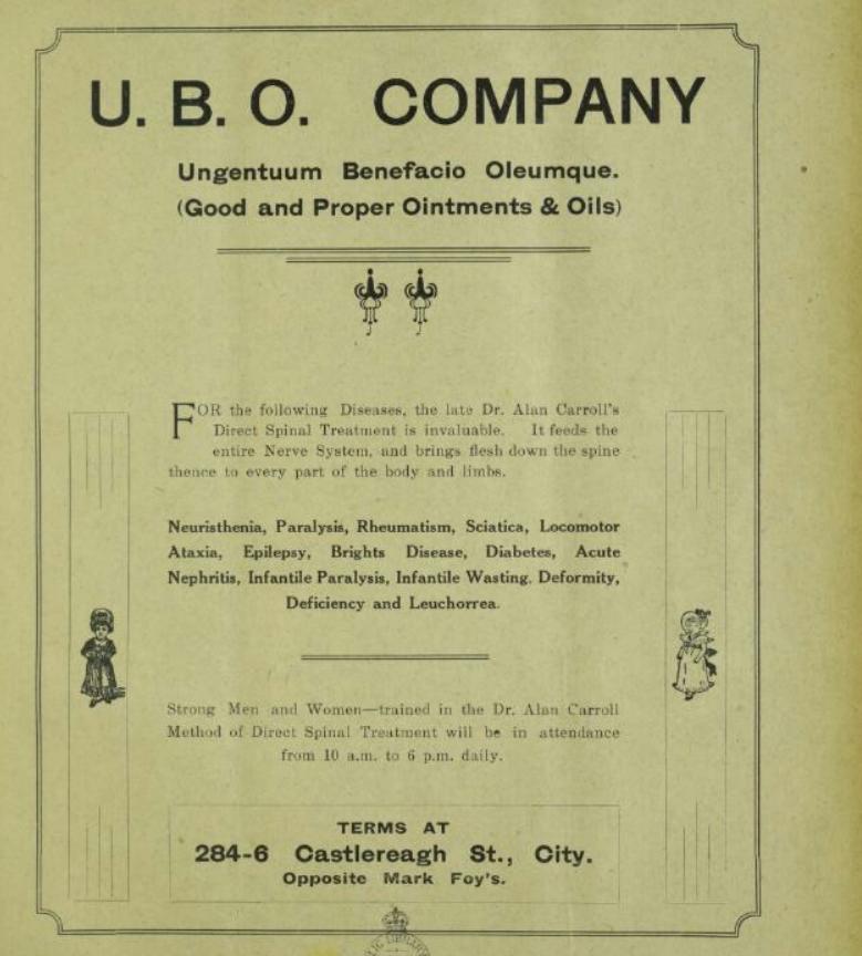 [145] The Sydney Stock and Station Journal (Sydney, NSW), May 30, 1911, 7. UBO stood for ‘Ungentuum Benefacio Oleumque’ translated as ‘Good and Proper Ointments and Oils’. The Latin is perhaps as dubious as the claimed benefits of the UBO company.
