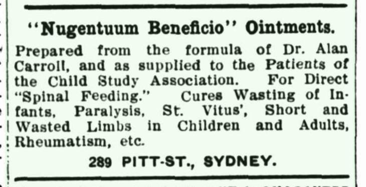 [127] The CSA gives the year of 1903 as the commencement of Carroll’s curative work. The figures in this report are imprecise and inaccurate The Daily Telegraph (Sydney, NSW), December 20, 1906, 4. There is evidence of advice given by Carroll on a particular child in 1904. ‘Mrs. Izett also spoke of the benefit that a child she was interested in had received after being treated as the president of the association had advised.’ The Daily Telegraph (Sydney, NSW), June 30, 1904, 3.