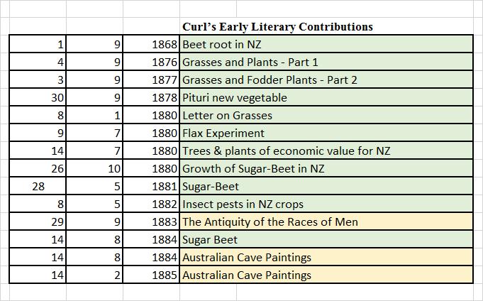 An examination of Curl’s literary interests while in NZ (see Table) indicate a predominance of contributions in the Agricultural and botanical disciplines (green) but not long prior to his removal to NSW his interests were becoming more Anthropological (yellow):