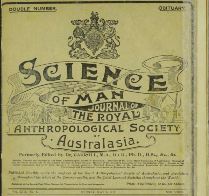 [96] It was later called from February 1898 Science of Man and Australasian Anthropological Journal and from 1900 having grant the right to use the prefix Royal – Science of Man and the Journal of the Anthropological Society of Royal Australasia.