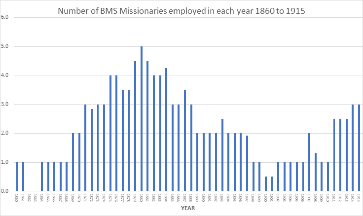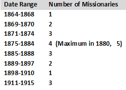 The number of missionaries employed by the BMS in any particular year varied over the period 1864 to 1915 and depended, in part, on the ability of the BMS to fund the position. Thus, the BMS in its provision of missionaries was dependant on the economic cycle, at least after its ministry became well known. When times were prosperous multiple missionaries were employed while in difficult times the number was reduced; from 1864 onwards, however, at least one missionary was employed at all times.