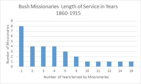 The life of the Bush Missionary was tough; he was absent from family for around nine months of the year, was constantly travelling and the remuneration was not large. It is little wonder then that there was a considerable turnover in missionary personnel. The periods of service for those employed between 1860 and 1914 is shown in this table below: