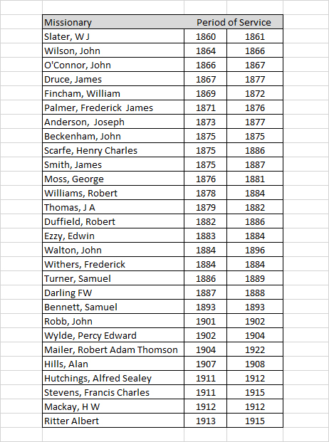 Of the 30 men employed in the period 1860 to 1915, some 8 missionaries only gave 1 year or less of service. The reasons for this were no doubt chiefly the challenging conditions of the work but while there was a significant turnover in the missionaries, vacant positions were usually quickly filled. Twelve served between 2 and 4 years and there were 5 men who served for more than 10 years with the longest serving 19 years during this period. Those who left often went into other forms of Christian ministry.