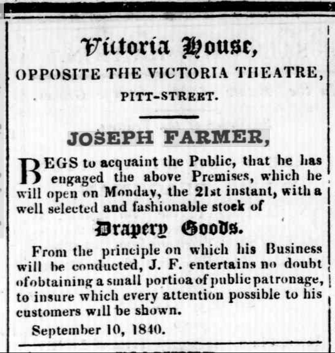[19] Commercial Journal and Advertiser (Sydney, NSW), 12 September 1840, 3;SMH, 16 October 1850, 3; G. P. Walsh, ‘Farmer, Sir William (1832–1908)’, Australian Dictionary of Biography, National Centre of Biography, Australian National University, https://adb.anu.edu.au/biography/farmer-sir-william-3498/text5371, published first in hardcopy 1972, accessed online 27 May 2021.