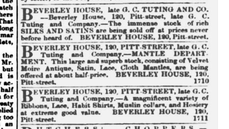 Tuting sought a Certificate of Discharge in March 1856 in order to resume business as Tuting & Co, but it was not immediately granted. He did, however, return to business in November 1856 at Beverley House, 118-120 Pitt Street but by August 1860 he had ceased trading and indicated he was ‘retiring from business and proceeding to the interior’. All the stock of Beverley House was sold as well as his expensive household furniture and goods.[35]