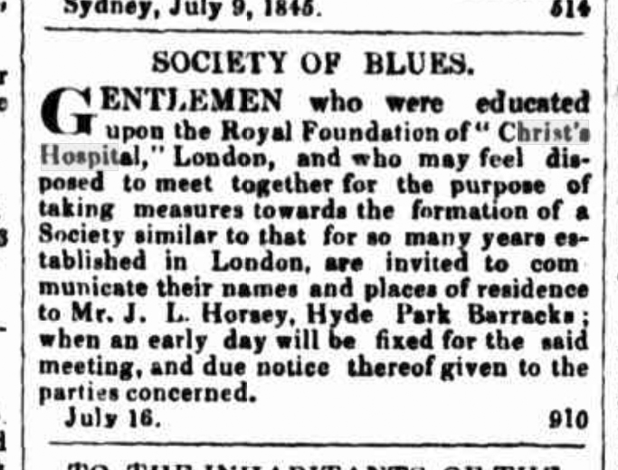He (Mr. Pinhey) would express a sincere hope that many gentlemen who had been educated at Christ’s Hospital, and who, scattered about this colony, might not be aware of the inauguration of this Society of Blues, might come forward with helping hands, and assist the early founders in the full establishment of what it was believed would be one of the permanent institutions of the colony. (Cheers).[67]