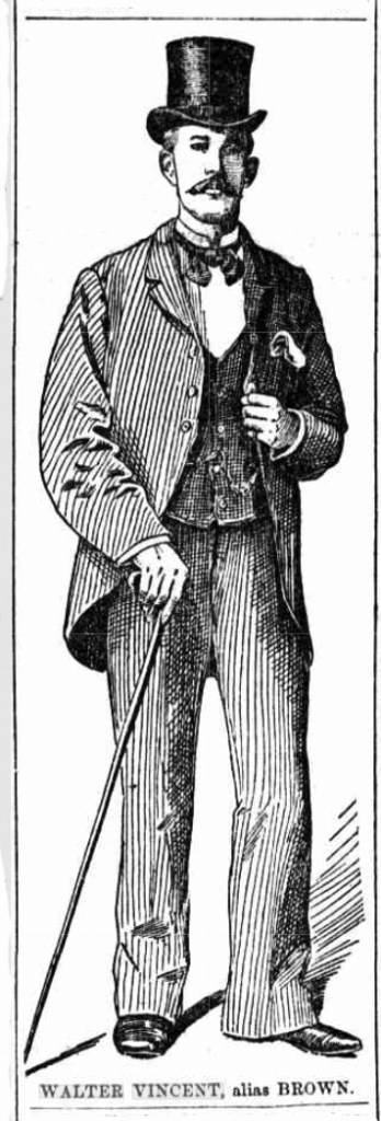 One such fraudster was Walter Vincent alias Brown (which was said to be his actual name), alias King, alias Larkins and alias Lucas.[17] He was an Englishman, born around 1857, who had arrived in the colony of New South Wales in 1883-4 on the ‘Crown of Aragon’, and he was, he said, a dentist. As most of this information comes from Vincent himself, its veracity is unknown, but as far as being a dentist is concerned, the only extraction he did was of other people’s money. He first came to the attention of law enforcement in 1891 when he was arrested while loitering, without apparent reason, in the upstairs corridor of a hotel. Suspected of intending to steal the occupant’s valuables, he was, in October 1891, sentenced to 2 months’ hard labour.[18]