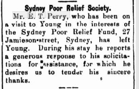 The next reference to Mr E T Perry is in October 1911, when he had begun collecting funds for the SGPRF,[41] though it is clear he had been working for the SGPRF in Sydney from around January 1911. His practice was to see that the local newspapers knew he was in town collecting on behalf of the SGPRF[42] so that his presence in the district was noted. At the end of his time in a district, he issued a thank you through the newspaper to the local community for their support.[43]