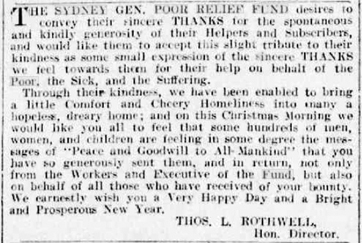 THE SYDNEY GENERAL POOR RELIEF FUND desire to THANK all those who by their assistance and hearty co-operation during the Christmas distribution and generally throughout the ordinary relief work, have so largely contributed to the success of the work of the fund, and are most grateful to them for their ungrudging sympathy. L. V. ROTHWELL, Gen. Director. 255A George-street, Sydney[9]
