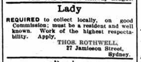 At the same time as the various fundraising events were organized by Rothwell with the assistance of kind-hearted and trusting supporters, he was seeking collectors who would collect funds in country areas on behalf of the SGPRF. E.T. Perry had done this from around 1911 until 1914, but Rothwell intensified his efforts in 1912 to raise funds from the canvassing of country towns. A series of advertisements began to appear in local country newspapers seeking collectors for the following areas: [65] Tamworth, Jerilderie, Urana, Hay and Molong. The collectors he sought were Ladies, residents of and well known in the collection area, a criterion that would probably get a sympathetic response as they knocked on doors, and who would not ask him too many difficult questions about the use of the money.