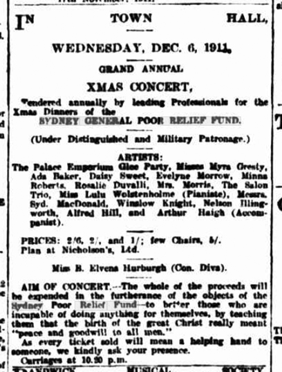 Elvena Hurburgh, in aid of the SGPRF, joined a touring company which gave performances in January 1912 on the South Coast[7] and, shortly after her marriage to the honorary director of the SGPRF, she even participated in a musical performance in Berrigan.[8] There was clearly strong support for the SGPRF within the Sydney music community. It was no doubt seen by such as a good opportunity to preform before an audience and a good time to include their students so that they might gain valuable stage time experience.