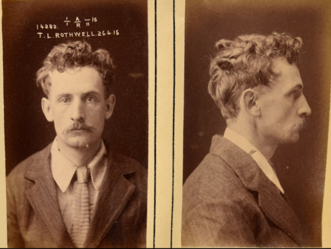 Thomas Lovell Rothwell[50] (pictured below in gaol photo dated 1904) was born in Camden, NSW, in 1885 to William John Rothwell and Susan Jessie Gibson. He had two brothers, William Taylor, born in 1883, and Stanley Gibson, born in 1887. He married Sylvia Clarice Hall (1871-1910) in 1904 and then, in 1912, after Sylvia’s death, he married Bertie Elvena Hurburgh (1881-1961).