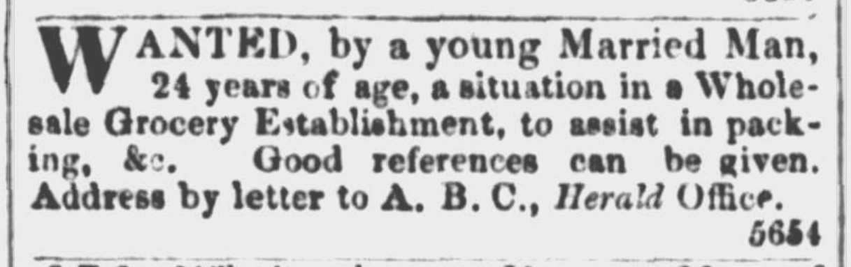 When and how John came to be employed in Sydney is unknown. He may have placed an advertisement like the one below for it fits him well; he was at that time 24 years old, married, and he did end up working in the grocery business.[16] It is known that he was in Sydney by June 1853[17] but not if he was employed in the grocery trade by that time.